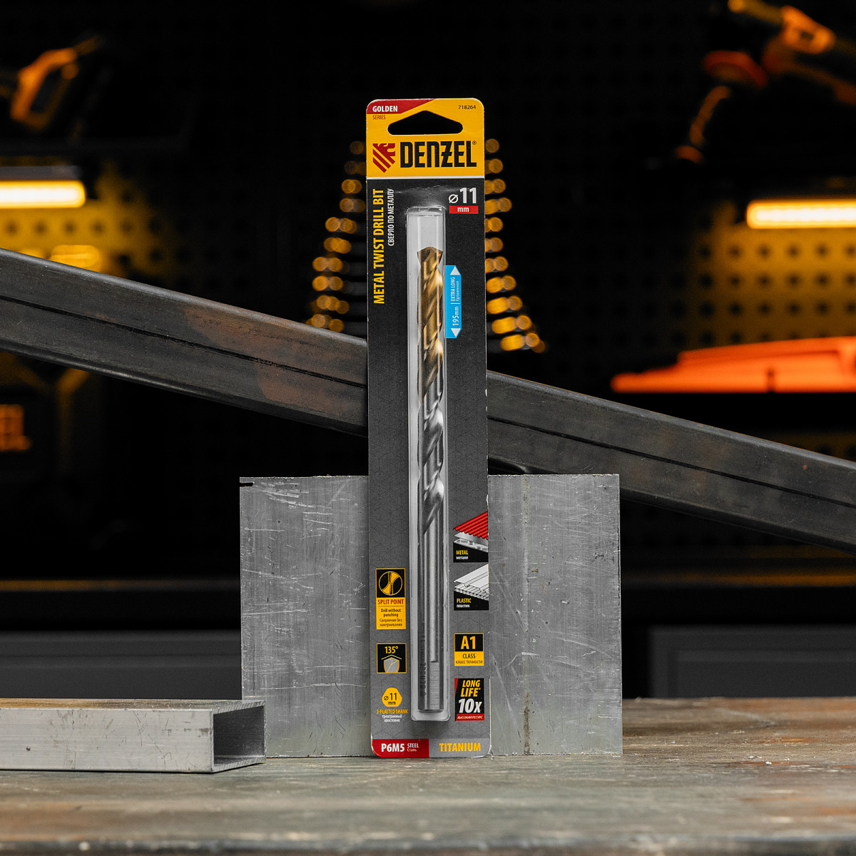 Удлиненное спиральное сверло по металлу Denzel Golden Tip 718264 из стали P6M5, размером 11 х 195 мм, предназначено для получения отверстий в легированных и цветных металлах — меди, алюминии, мягкой бронзе, титане, латуни. Оснастка позволяет эффективно справляться с этими задачами благодаря оптимальному углу заточки 135°. Класс точности A гарантирует высокое качество работ, а удлиненный профиль позволяет сверлить глубокие отверстия. Сверло используется для проведения монтажно-сборочных работ.