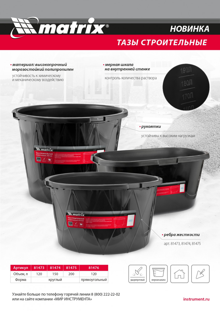 Круглый строительный ударопрочный таз Matrix 81473 с ребрами жесткости, объемом 120 л, универсален в применении: он используется для перемешивания строительных смесей, хранения сыпучих материалов и воды для технических нужд. Будет полезен во время проведения строительно-отделочных работ, пригодится также в подсобном хозяйстве и на огороде.
