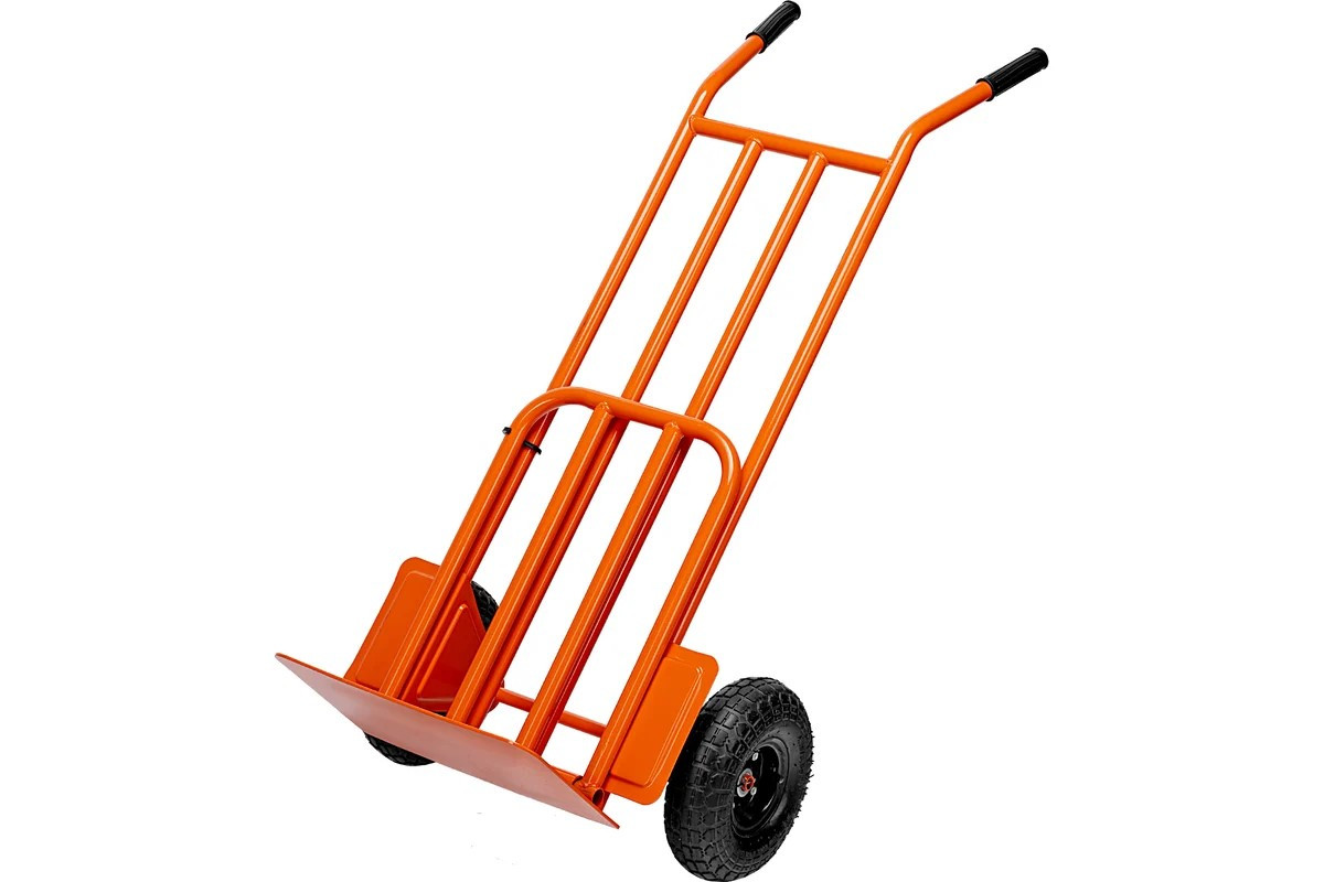Ручная двухколесная тележка с пневматическими колесами диаметром 260 мм и откидной платформой размером 530 х 400 мм имеет усиленную конструкцию и используется для перемещения крупных грузов массой до 250 кг. Пригодится на складе и на производстве. ПреимуществаПрочность и защита от коррозии — рама диаметром 25 мм выполнена из стали толщиной 1,3 мм и покрыта порошковой эмальюФункциональность — откидная платформа позволяет размещать на тележке груз с увеличенными габаритамиЭргономичность — изогнутые назад рукоятки делают более удобным перемещение тележки, а также могут служить упорами при горизонтальной погрузкеУдобная транспортировка груза — пневматические колеса с камерами, резиновыми шинами и 2 шарикоподшипниками в каждом гасят вибрации и обеспечивают плавный ход