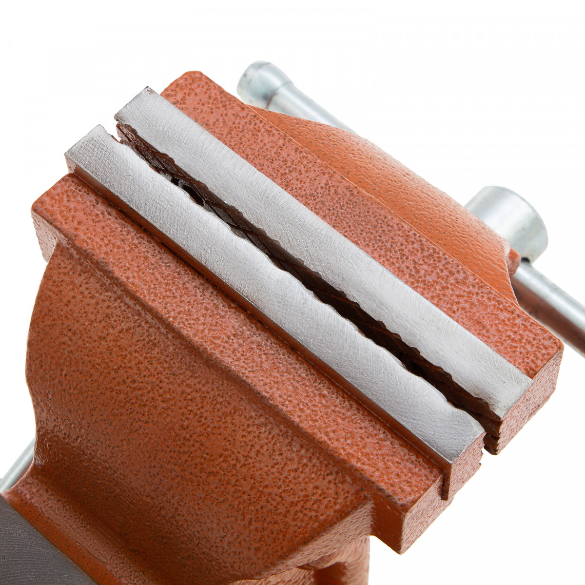 - Корпус тисков выполнен из чугуна, а губки — из стали, благодаря чему достигается высокая прочность инструмента.