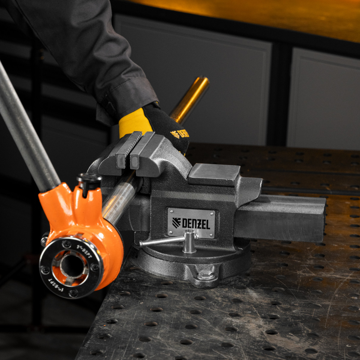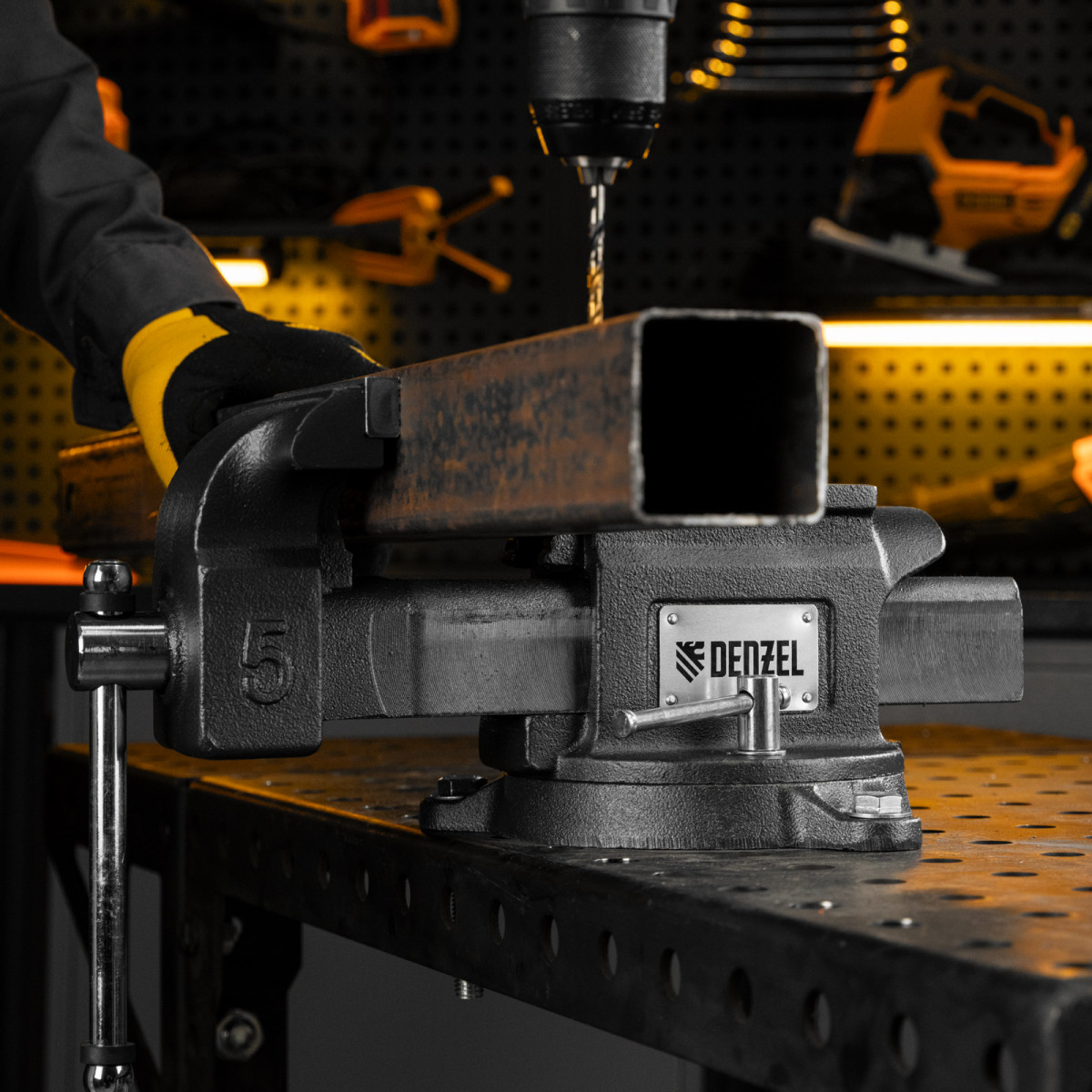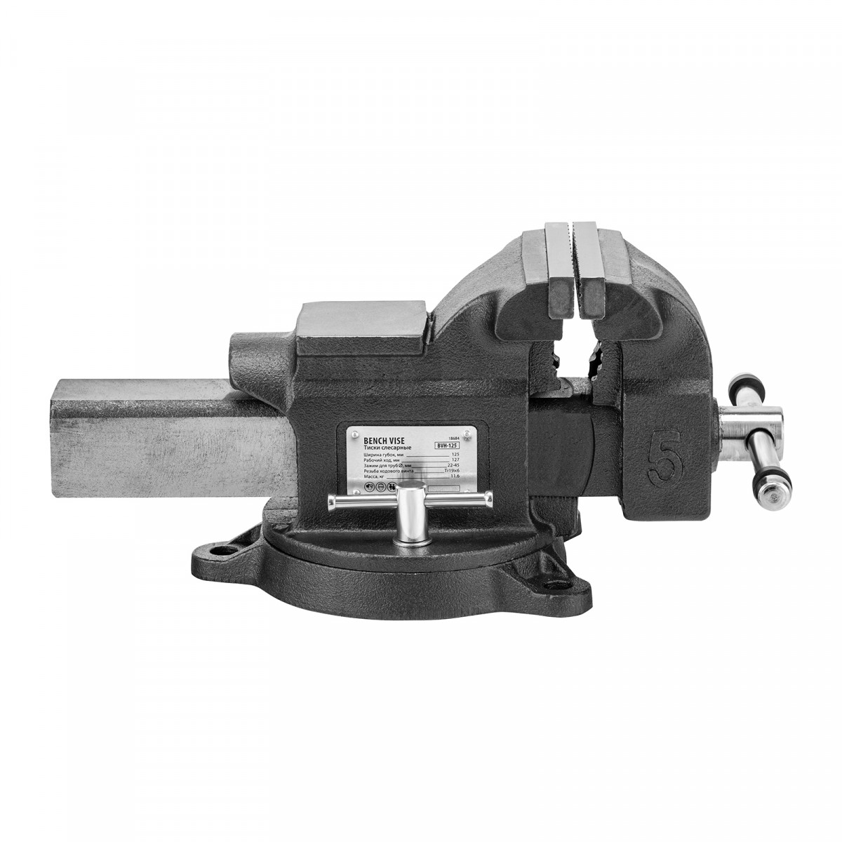 Слесарные поворотные тиски Denzel BVH-125 18684 с губками шириной 125 мм и стальной направляющей предназначены для фиксации деталей и заготовок, а также для выполнения мелких ударных работ — в конструкции предусмотрена наковальня. Рабочий ход составляет 125 мм, глубина зажима — 70 мм. Специальный зажим позволяет фиксировать трубы диаметром 22-45 мм, что расширяет возможности использования инструмента. На губки можно установить защитные накладки (приобретаются отдельно) для предотвращения повреждения зажимаемых предметов. Тиски пригодятся в мастерской и гараже.