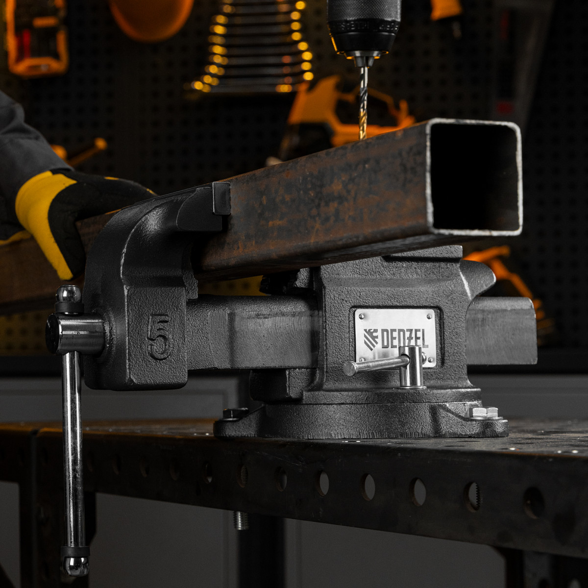 • Функциональность — тиски поворачиваются на 360°, что позволяет менять и выбирать позицию инструмента для удобной работы с заготовкой.