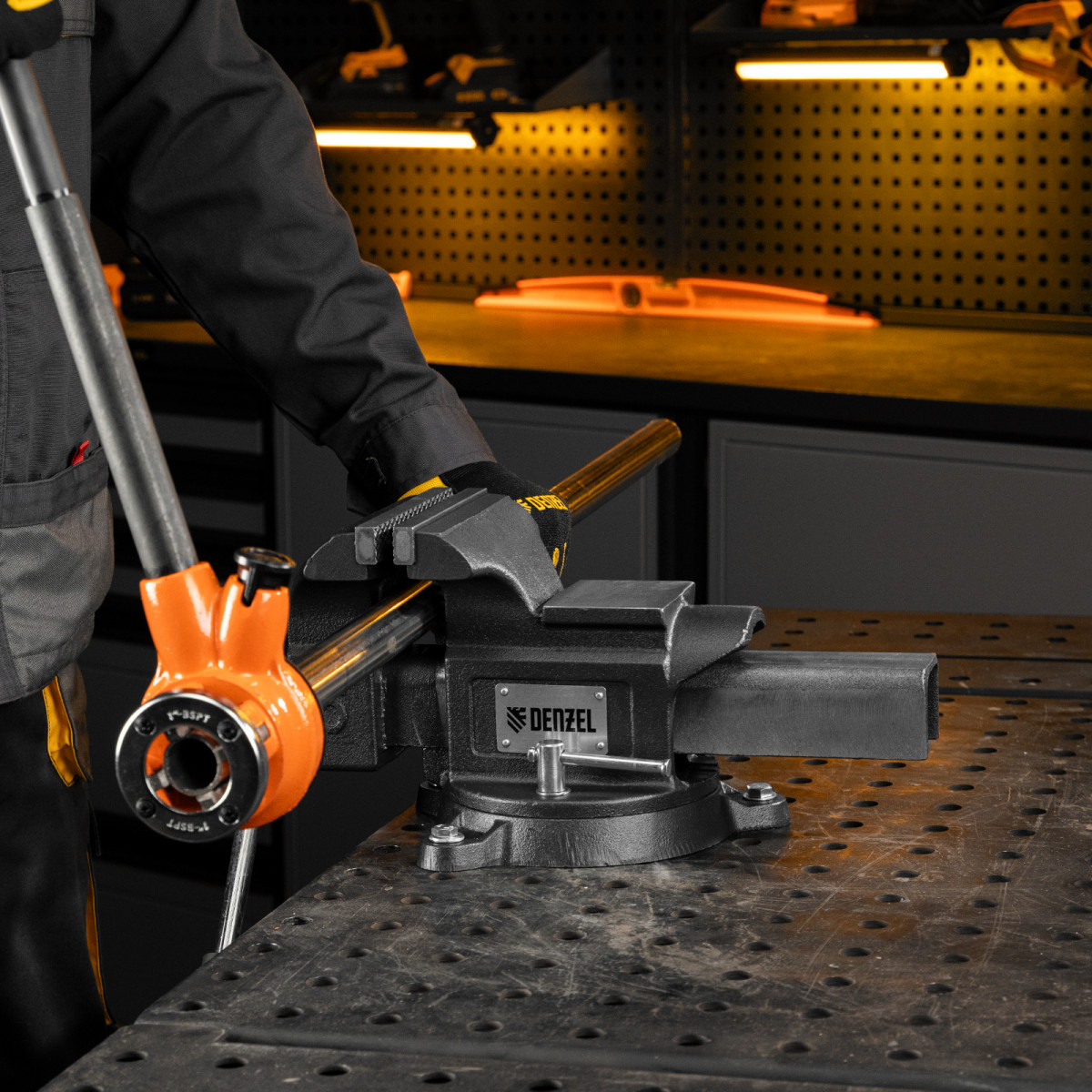 Слесарные поворотные тиски Denzel BVH-150 18685 с губками шириной 150 мм и стальной направляющей предназначены для фиксации деталей и заготовок, а также для выполнения мелких ударных работ — в конструкции предусмотрена наковальня. Рабочий ход составляет 150 мм, глубина зажима — 85 мм. Специальный зажим позволяет фиксировать трубы диаметром 22-60 мм, что расширяет возможности использования инструмента. На губки можно установить защитные накладки (приобретаются отдельно) для предотвращения повреждения зажимаемых предметов. Тиски пригодятся в мастерской и гараже.