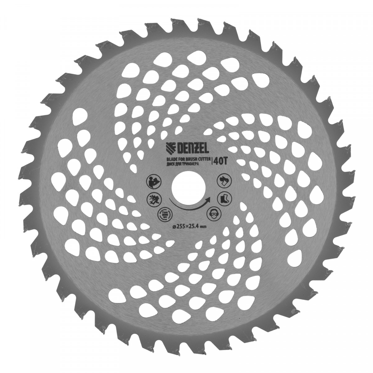 • Дополнительные возможности — можно приобрести и установить на триммер диск Denzel 96323 с шириной скашивания 230 мм для быстрого удаления растительности с жесткими стеблями, 96328 для скашивания молодых побегов кустарника диаметром до 3 мм.