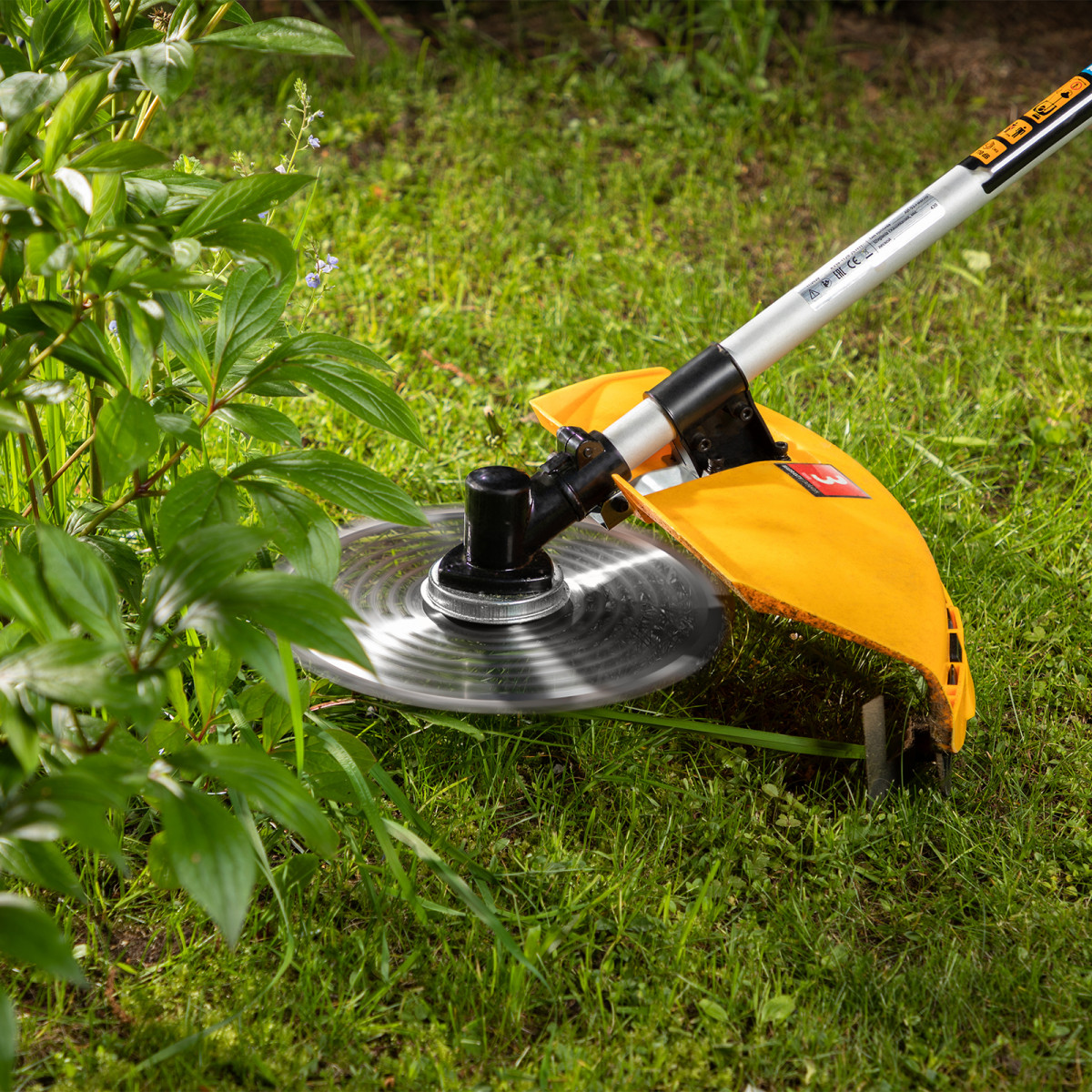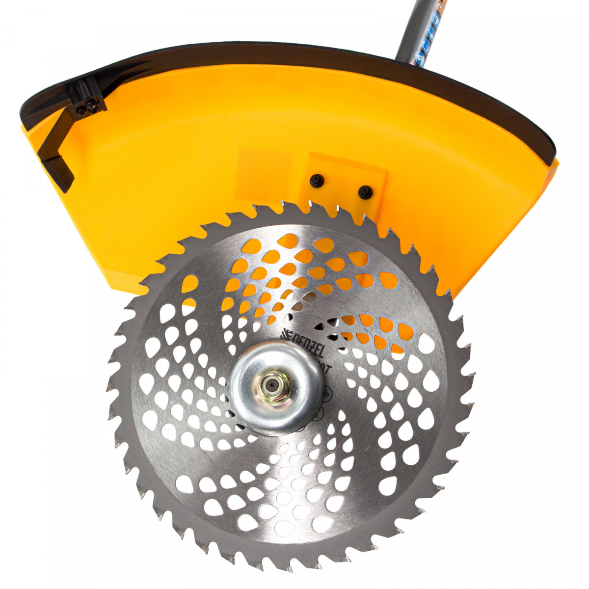 - Дополнительные возможности — можно приобрести и установить на триммер диски Denzel 96323, 96325 для быстрого удаления растительности с жесткими стеблями (полыни, крапивы, лебеды), 96328 для скашивания молодых побегов кустарника диаметром до 3 мм.