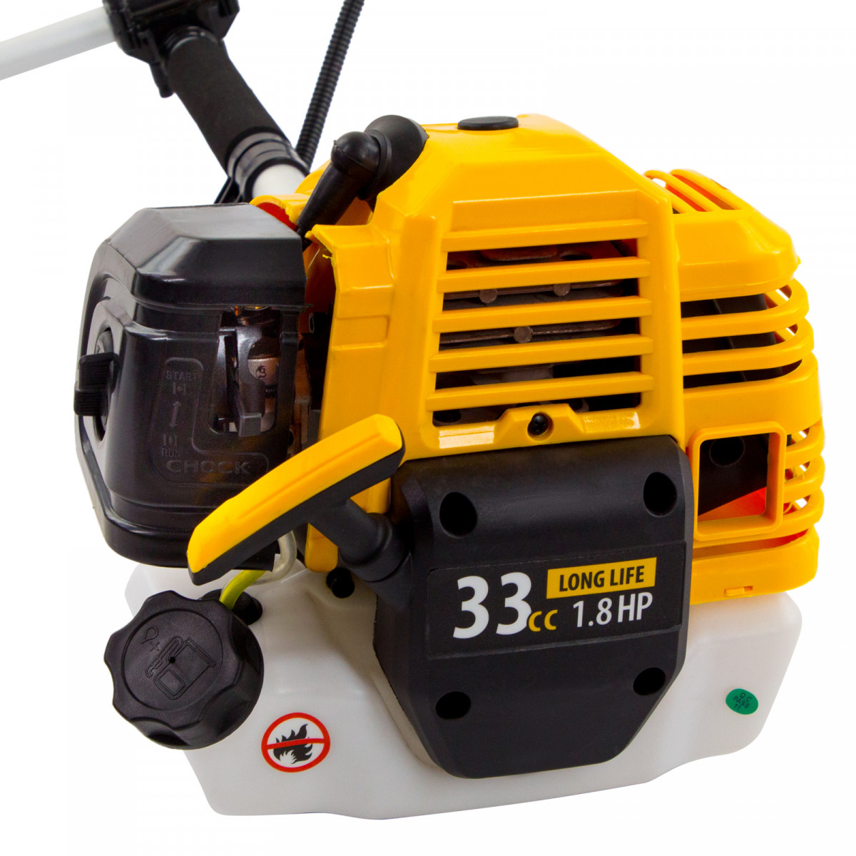 Бензиновый триммер Denzel DT-33S 96223 с двигателем мощностью 1,8 л.с. и объемом 33 см3, с разъемной штангой, поставляется комплектом из 2 частей и предназначен для подравнивания газона и скашивания травы всех типов, в том числе с жесткими древовидными стеблями (полыни, крапивы, лебеды, борщевика), а также срезания кустарника и молодых побегов деревьев с диаметром стволов до 10 мм. Удобен для работы в труднодоступных местах, может работать с мокрой травой. Режущими элементами являются катушка с леской и пильный диск, ширина скашивания составляет 420 мм и 255 мм соответственно.,Испытания подтвердили, что триммер способен работать до отказа 80 часов подряд.