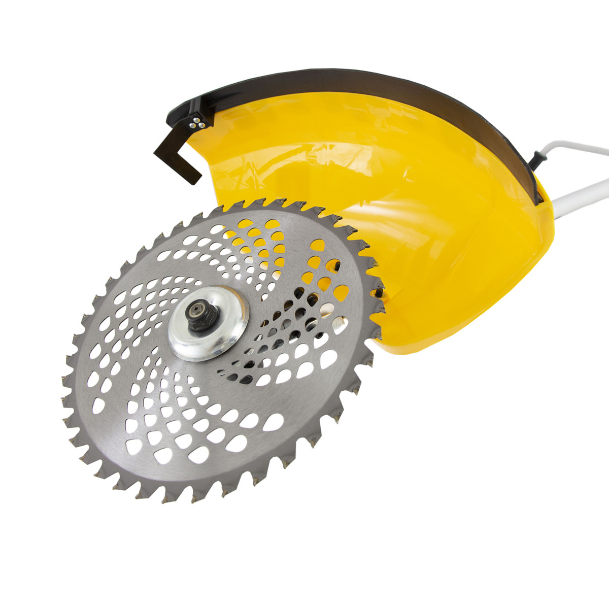 - Ограничительный нож — лезвие на пластиковом кожухе автоматически обрезает лишнюю леску, что обеспечивает защиту двигателя от повышенной нагрузки и перегрева.