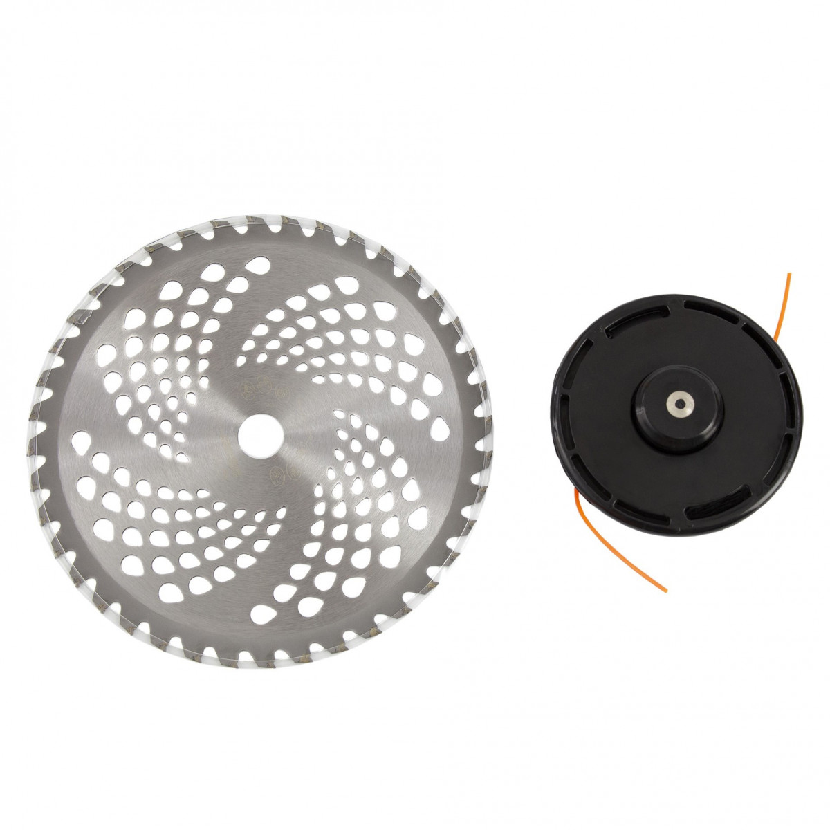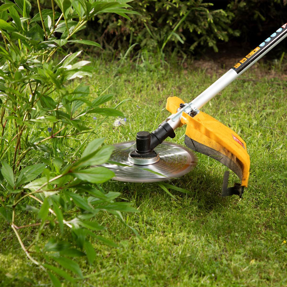 - Дополнительные возможности — можно приобрести диски Denzel 96323, 96325 для быстрого удаления растительности с жесткими стеблями, 96328 для скашивания молодых побегов кустарника диаметром до 3 мм.