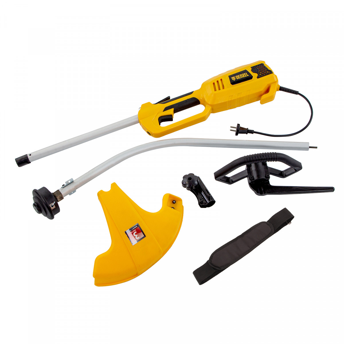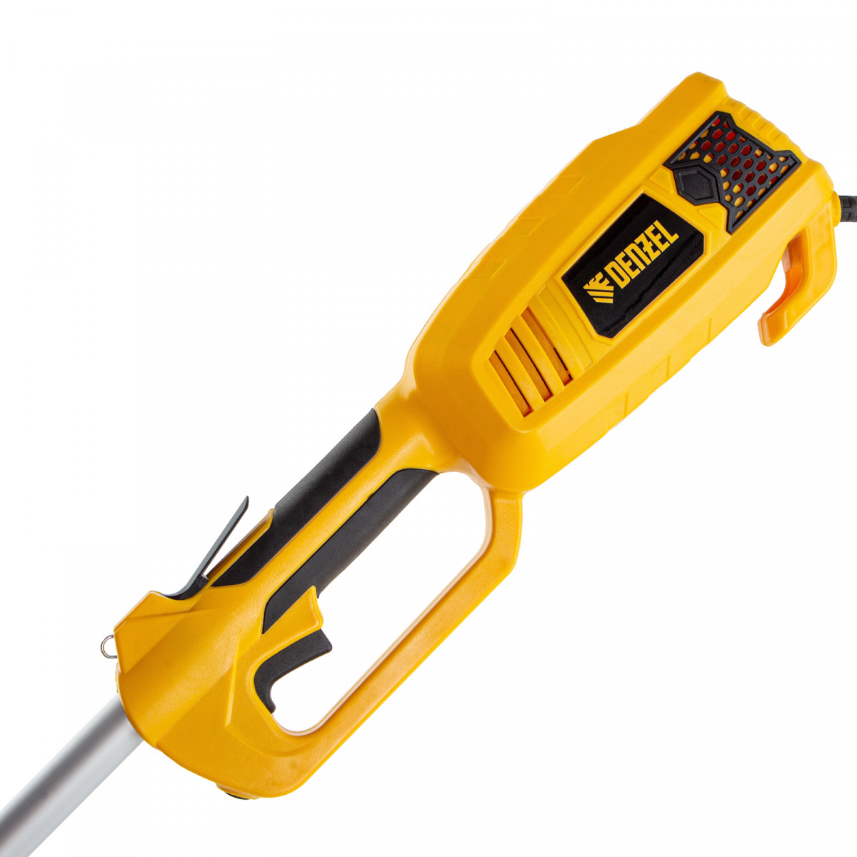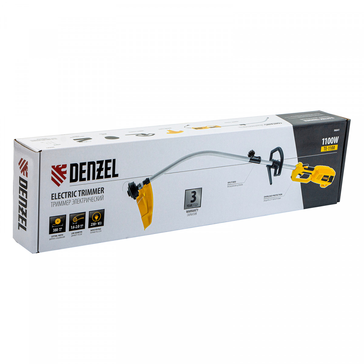 Электрический триммер Denzel TE-1100 96641 мощностью 1100 Вт, с разборной штангой и катушкой, предназначен для скашивания травы на дачном участке. Ширина прохода составляет 380 мм, что удобно для работы на небольших участках. Мощный двигатель обеспечивает вращение катушки со скоростью 6500 об/мин. Электродвигатель не требует приготовления топливной смеси и сложного технического обслуживания. Благодаря отсутствию вредных выбросов и неприятного запаха работа триммера для газона не вредит здоровью и не вызывает дискомфорт.,На триммер можно установить диск Denzel 96323 (приобретается отдельно) для быстрого удаления растительности с жесткими стеблями (полыни, крапивы, лебеды).