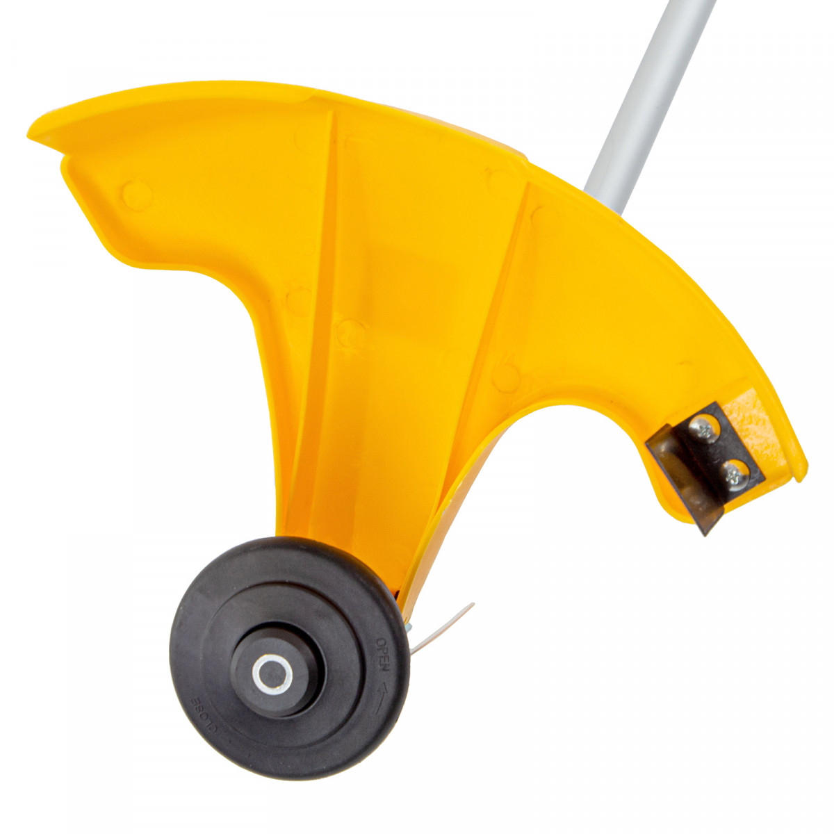 • Безопасность — блокировка выключателя препятствует случайному запуску, а защитный кожух предохраняет от летящей травы.