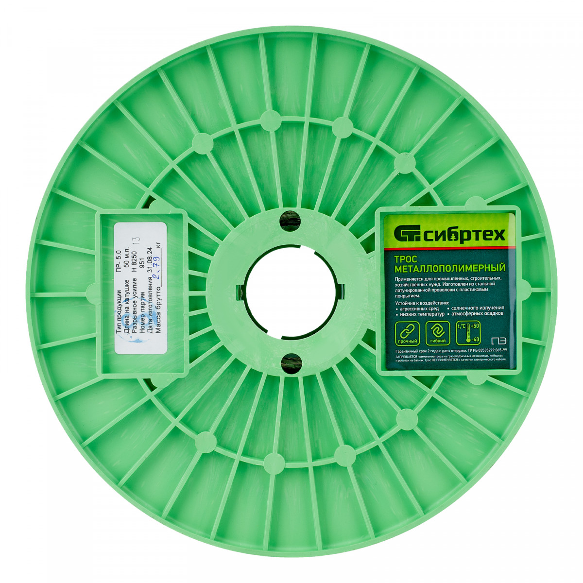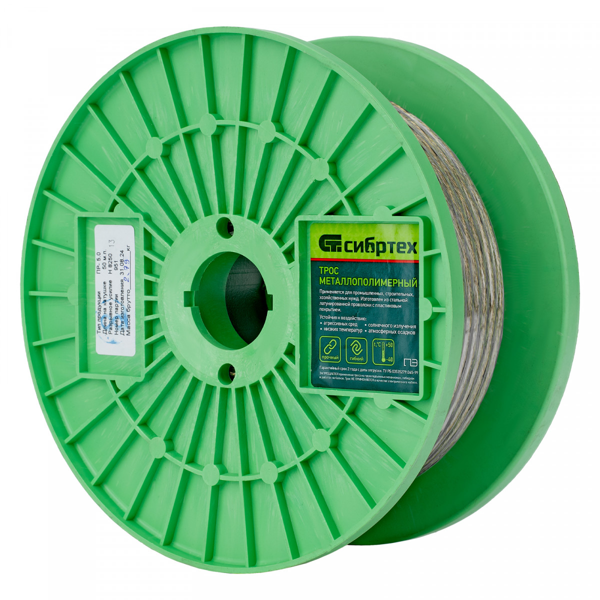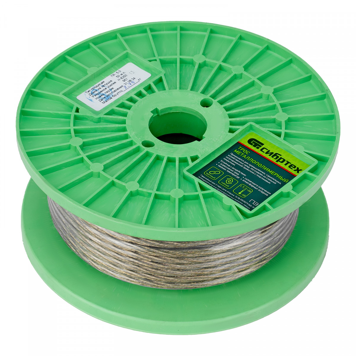 Металлополимерный прозрачный трос ПР-5.0 Сибртех 47639 толщиной 5 мм, 50 м. п. на катушке, используется для монтажа рекламных баннеров, установки ограждений, палаток, теплиц, погружения скважинных насосов и датчиков. Применяется в качестве садового троса-шнура для подвязки растений, а также может служить для развешивания белья. Жила шнура изготовлена из стальной проволоки, поэтому он выдерживает значительные нагрузки.
