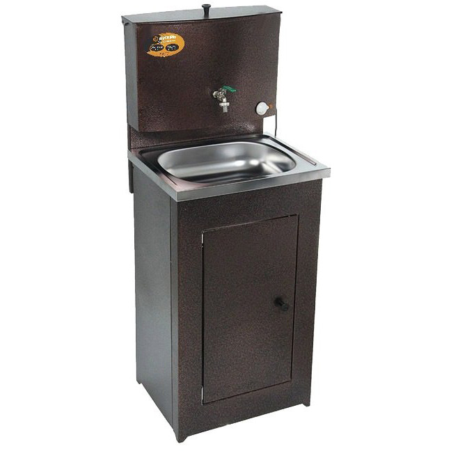 "Умывальник с подогревом, медного цвета, с металлической тумбой и нержавеющей мойкой. Умывальник ВИХРЬ отличается особой функциональностью, так как его можно установить как внутри дома, так и снаружи. Внутри тумбочки ставиться ведро или шланг для слива воды. Так как в таком умывальнике есть раковина, то его можно свободно использовать для мытья посуды.