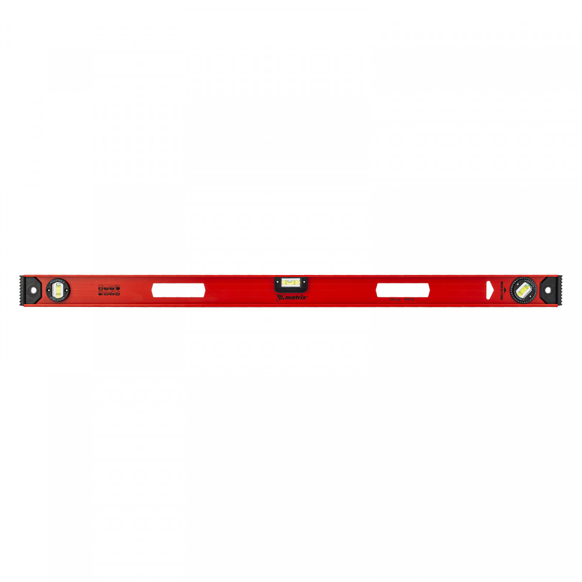 Уровень алюминиевый усиленный Matrix «Рельс» 34010 длиной 1000 мм снабжен 3 глазками для проверки отклонений относительно горизонтальной и вертикальной плоскостей. Поворотный глазок уровня позволяет выстроить произвольный угол. Инструмент пригодится строителю, отделочнику, бетонщику и другим специалистам.