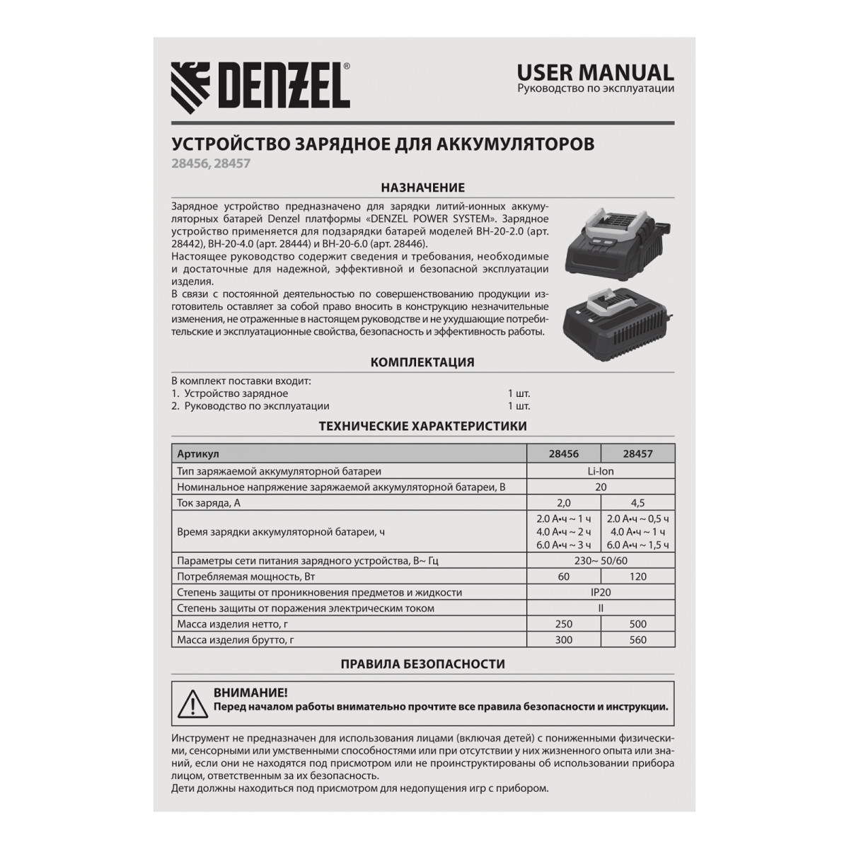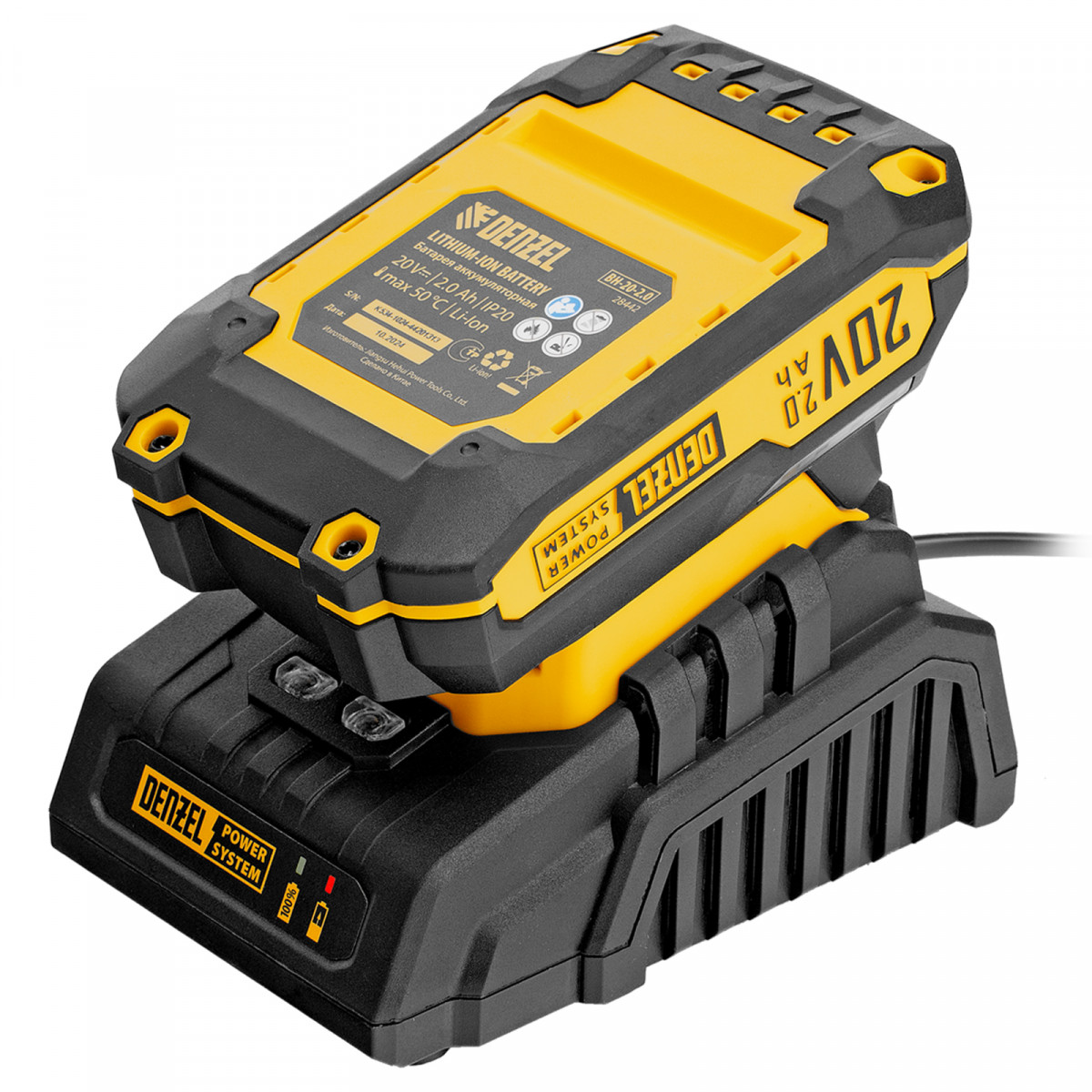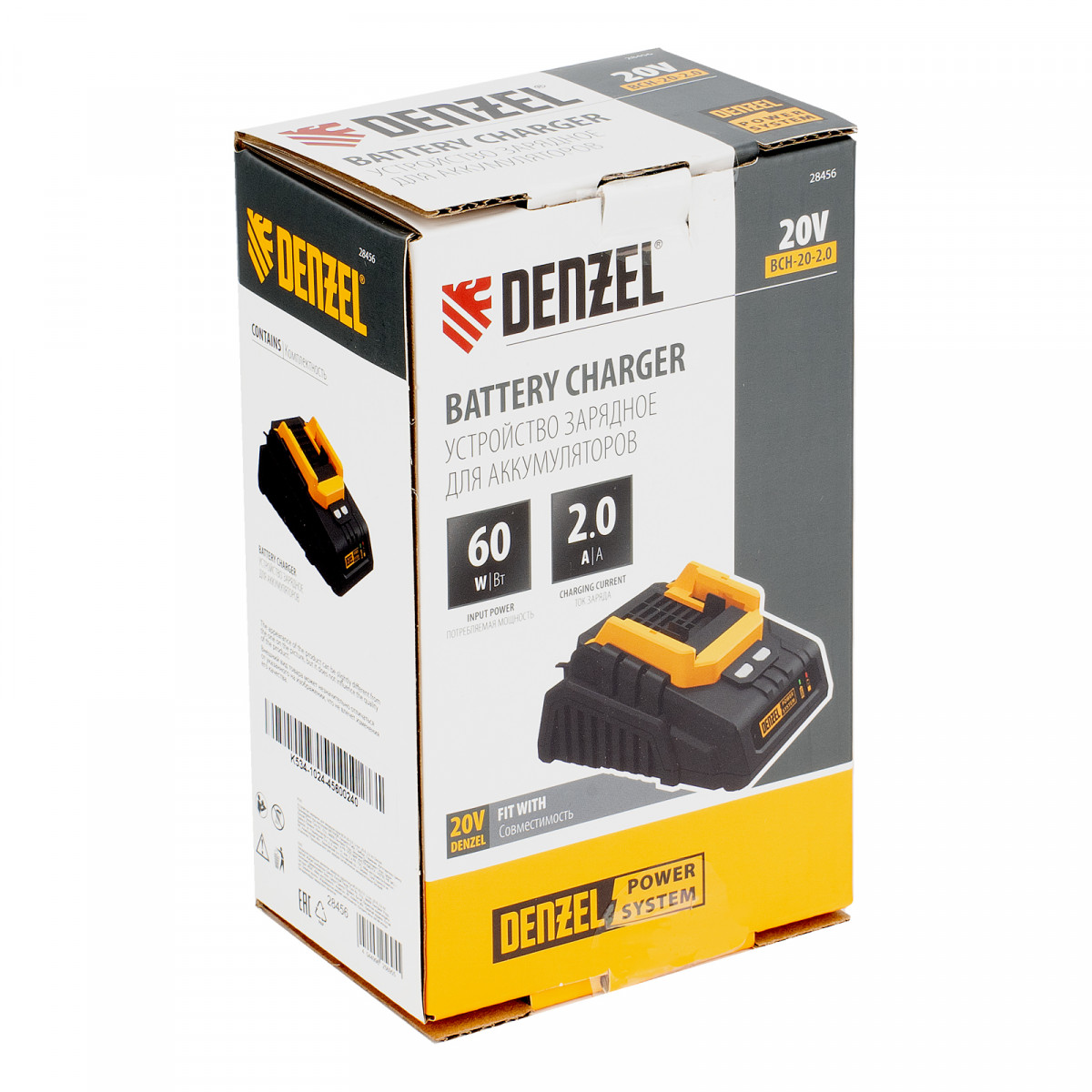 Зарядное устройство Denzel BCH-20-2.0 28456 поддерживает ток заряда 2,0 A и предназначено для восстановления работоспособности аккумуляторов Denzel Li-Ion 20 В (артикулы 28442, 28444 и 28446). Обеспечивает быструю и полную зарядку, что позволяет избежать длительных перерывов в работе с аккумуляторным инструментом.
