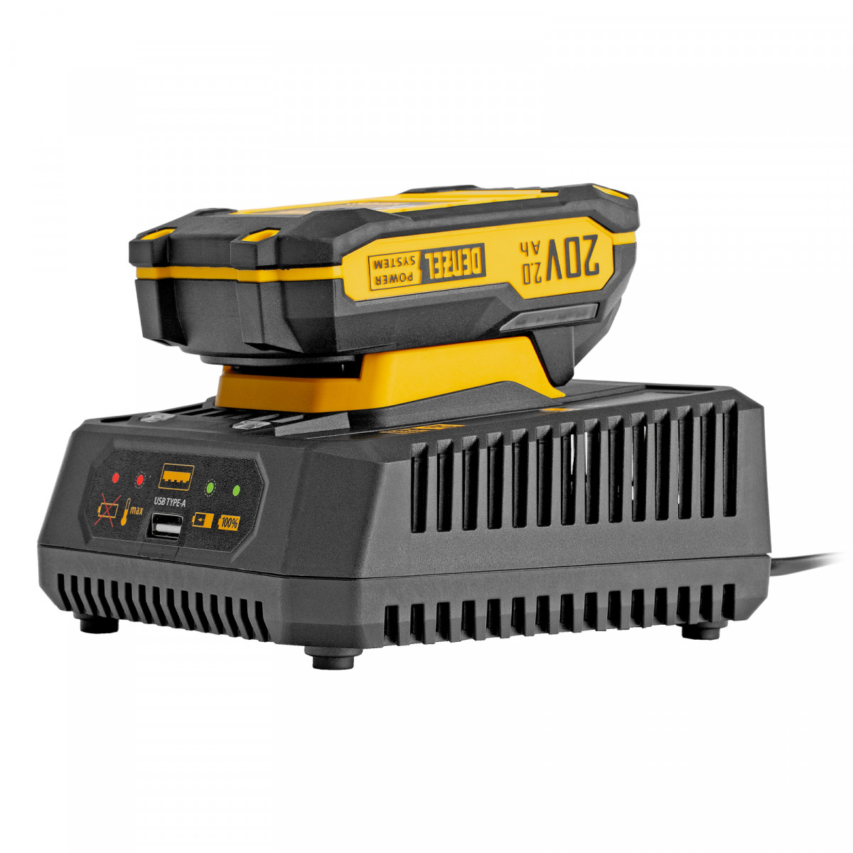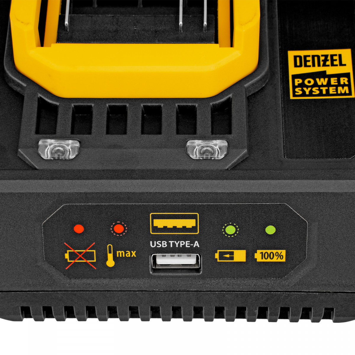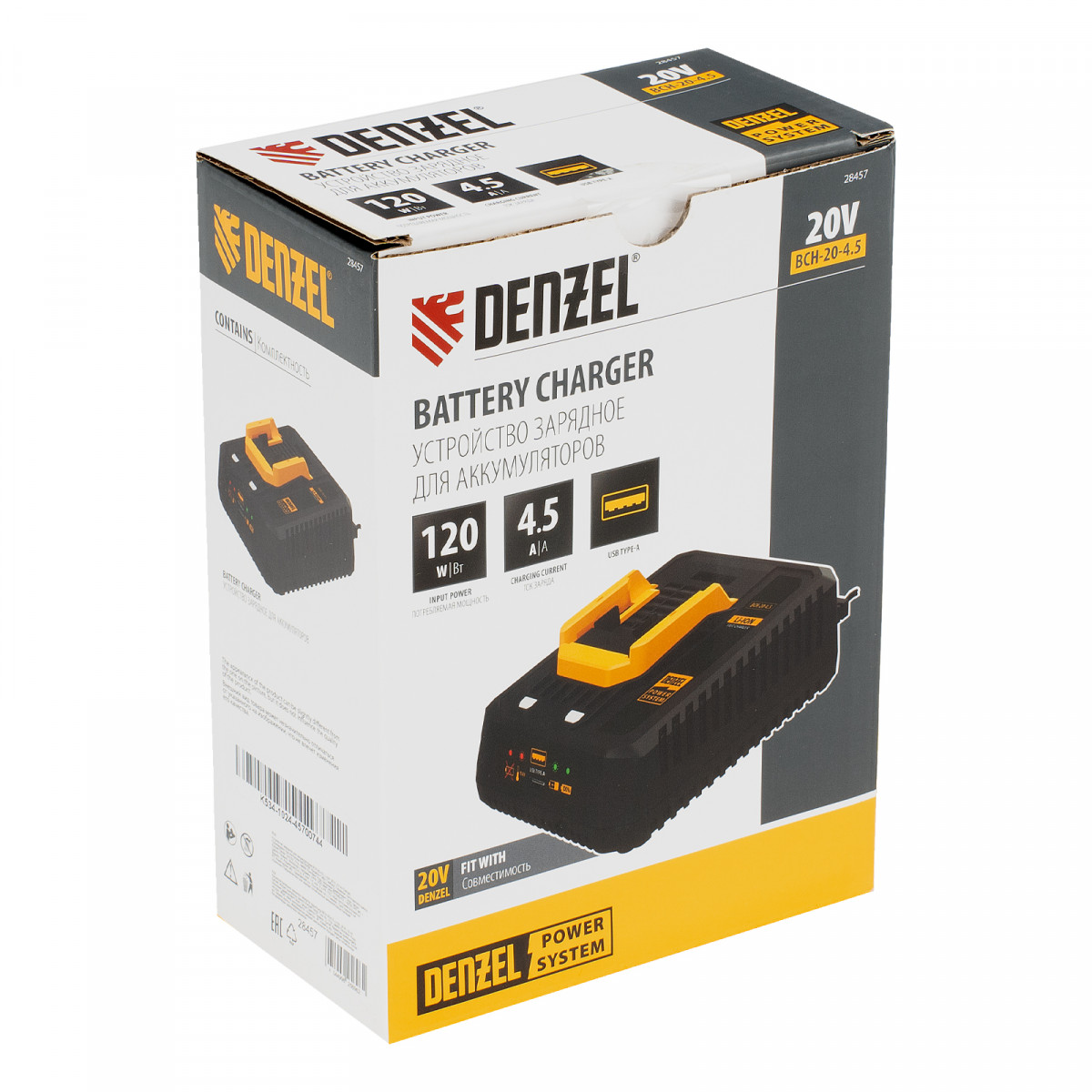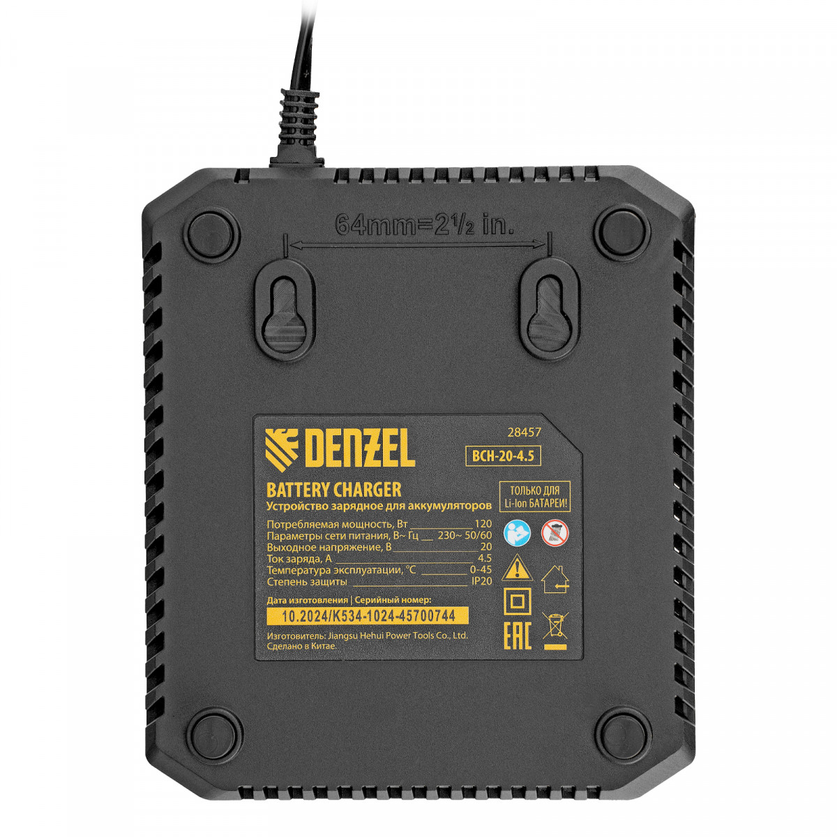 Зарядное устройство Denzel BCH-20-4.5 28457 поддерживает ток заряда 4,5 A и предназначено для восстановления работоспособности аккумуляторов Denzel Li-Ion 20 В (артикулы 28442, 28444 и 28446). Обеспечивает ускоренную и полную зарядку, что позволяет быстро вернуться к работе с аккумуляторным инструментом. Длина кабеля составляет 1,2 м, поэтому зарядное устройство удобно подключать к розетке.