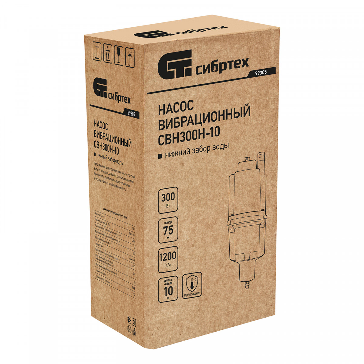 Вибрационный насос СВН300Н-10, нижний забор, 300 Вт, напор 75 м, 1200 л/ч, кабель 10 м Сибртех