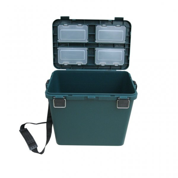 Объем ящика - 19 литров (поместятся снасти, термос, еда или пойманная рыба). В крышке ящика находятся 4 отделения с крышечками для хранения мелочей. В комлекте идет прочный ремень для переноски ящика.
