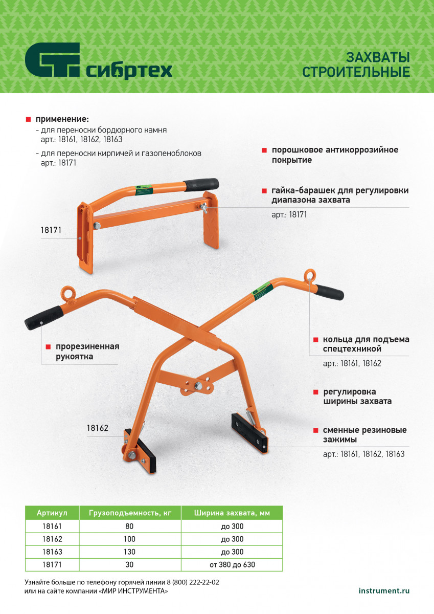 Ручной захват для бордюрного камня Сибртех 18162 — удобный и надежный инструмент, применяемый для установки дорожных бордюров, поребриков, бортового камня массой до 100 кг. Ширина захвата регулируется и может достигать 300 мм, что облегчает работу со стройматериалами разного размера.