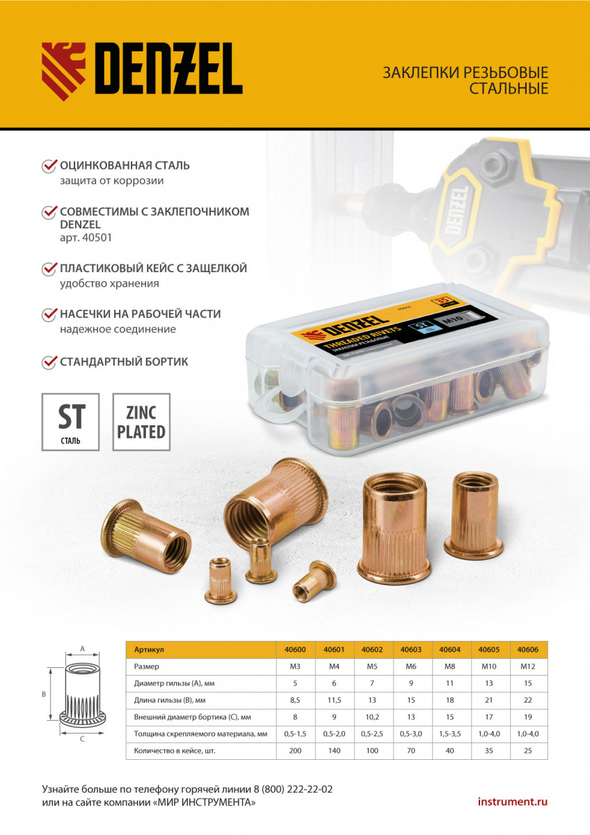 Заклепки резьбовые, стальные, оцинкованные, М10, пластиковый кейс, 35 шт. Denzel