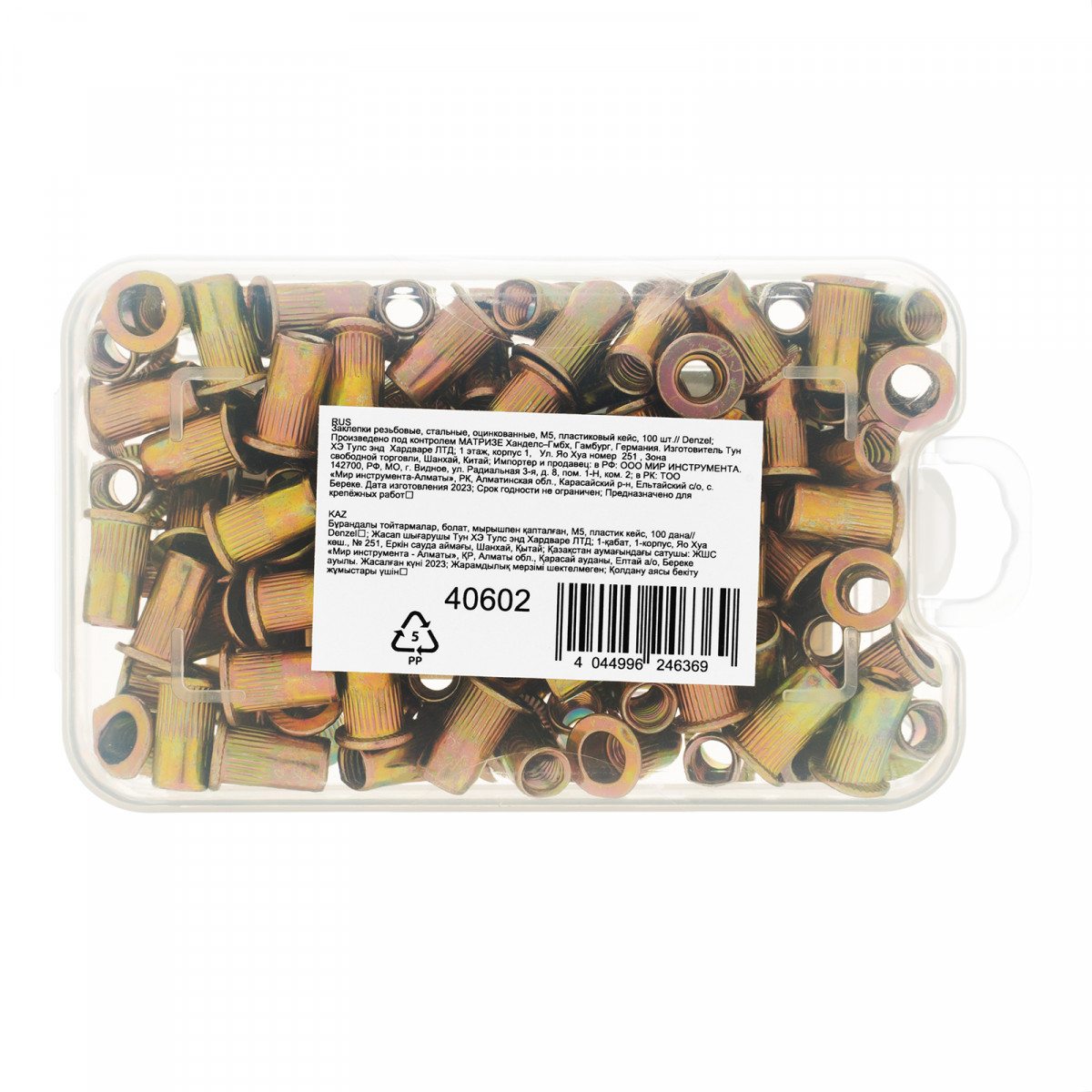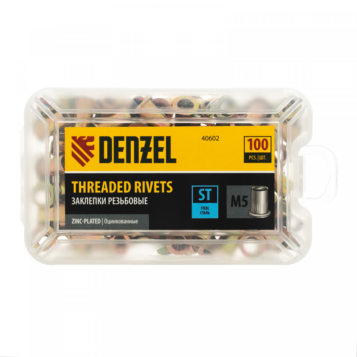 Заклепки резьбовые, стальные, оцинкованные, М5, пластиковый кейс, 100 шт. Denzel