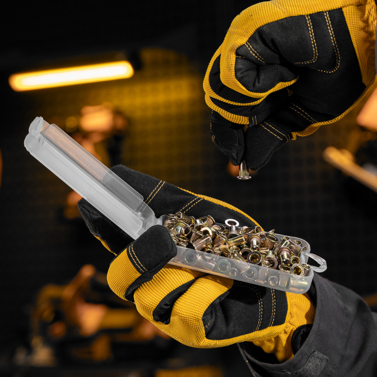 • Удобное хранение и транспортировка — заклепки поставляются в прочном пластиковом кейсе с защелкой.