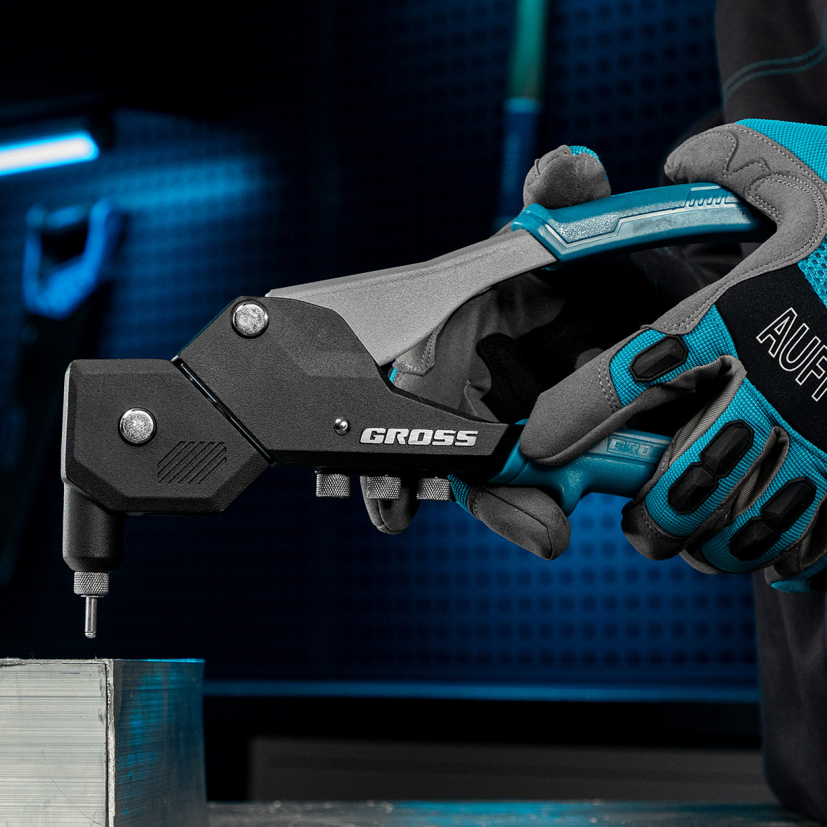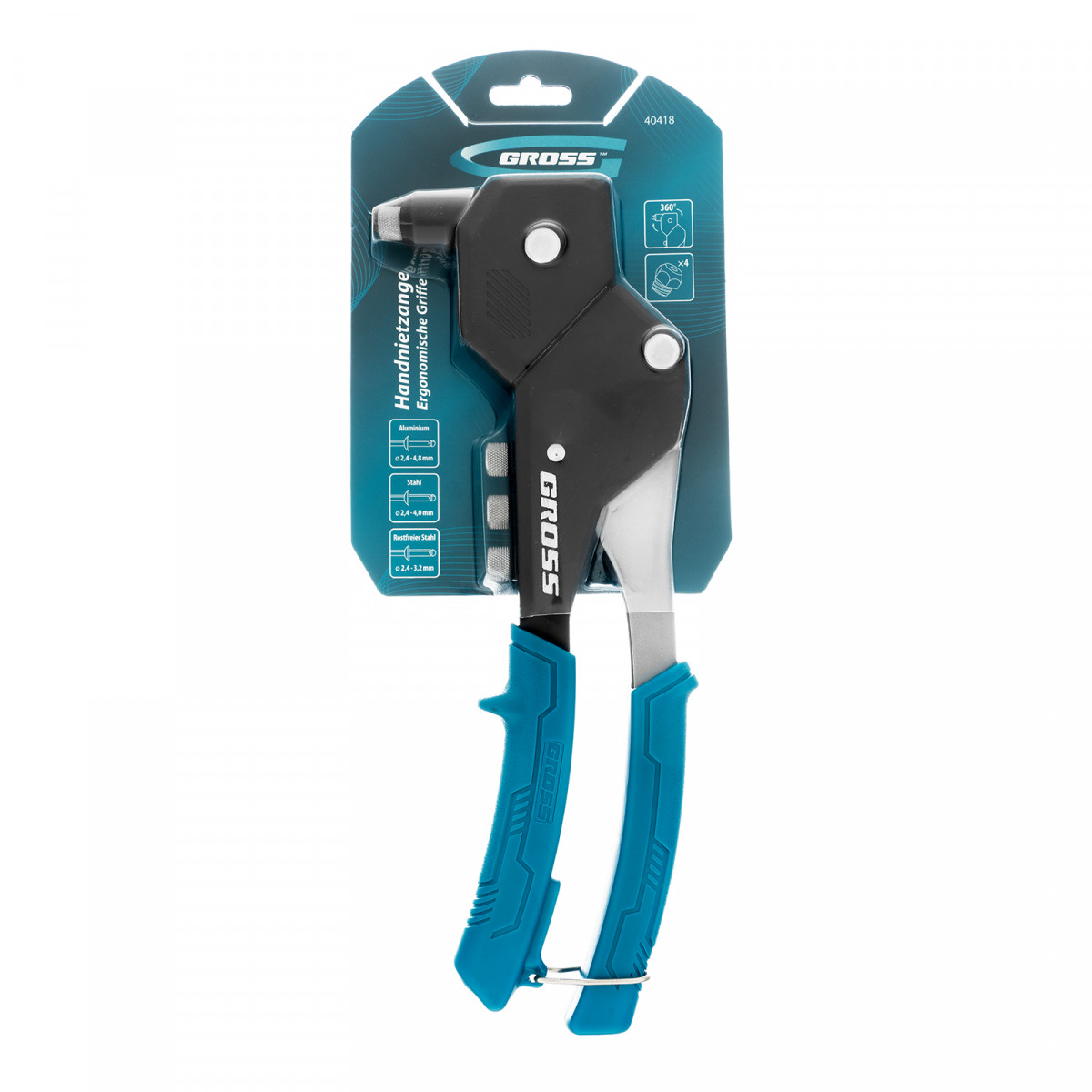 Заклепочник Gross 40418 длиной 290 мм, поворотный на 0-360°, используется для соединения плоских заготовок, металлических профилей и тонкостенных конструкций при помощи вытяжных заклепок из стали (типоразмер 2,4-4,0 мм), алюминия (2,4-4,8 мм) и «нержавейки» (2,4-3,2 мм). Обеспечивает быстрое и надежное крепление. Соответствующие сменные головки входят в комплект поставки. Поворотная голова облегчает работу в ограниченном пространстве. Инструмент будет полезен на строительной площадке, в ремонтной мастерской, а также в быту.