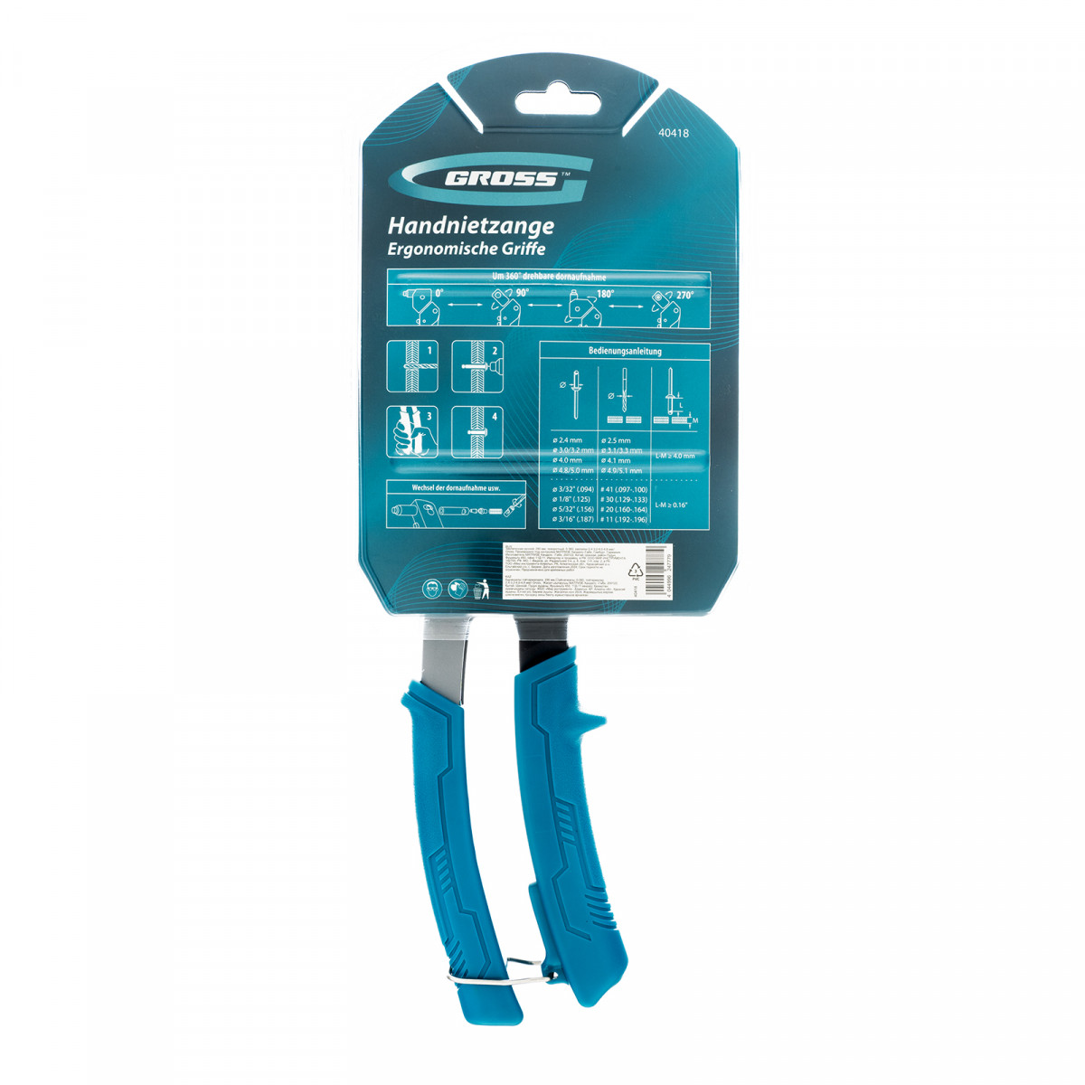 Заклепочник ручной, 290 мм, поворотный, 0-360, заклепки 2,4-3,2-4,0-4,8 мм Gross